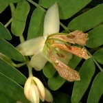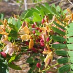 I fiori sono grandi, dal colore giallo-verde con striature rosse o arancioni, riuniti in racemi molto decorativi. I frutti invece sono rappresentati da dei legumi ricurvi dal colore marrone chiaro, contenenti diversi semi.